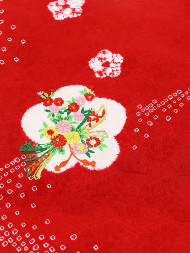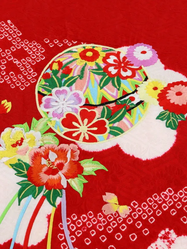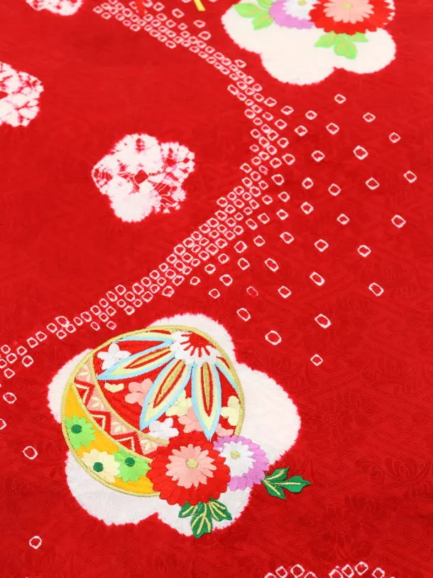 赤地に、鞠(まり)と花々が上品に描かれたお着物です。鞠(まり)と花々の丸みを帯びたデザインがふっくらと可愛らしい雰囲気です。流れるように施された絞り柄が上品かつ華やかな印象を添えます。お宮参りの参拝や、記念写真にオススメです。