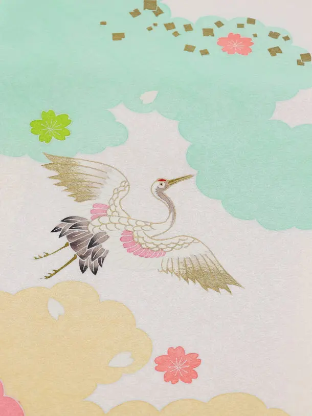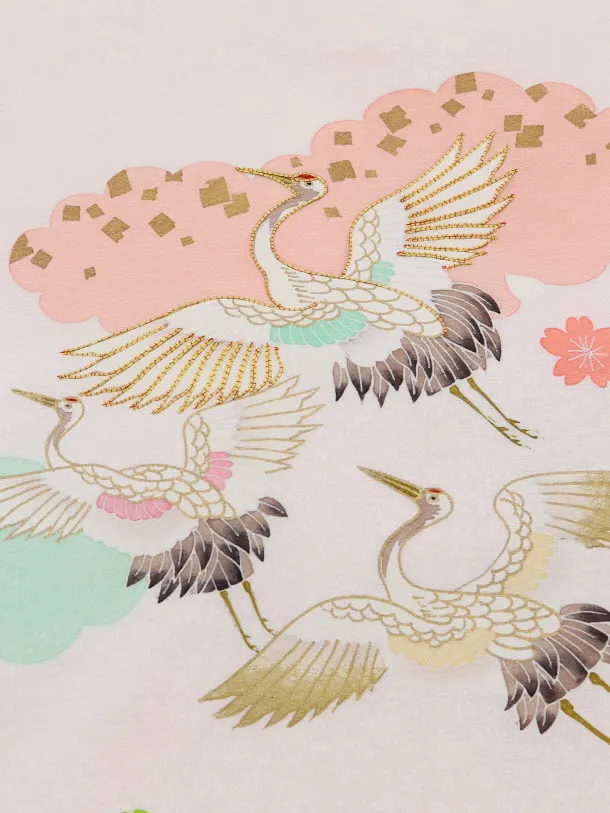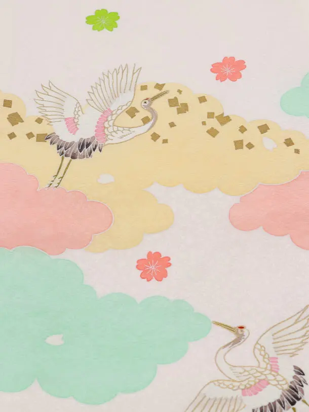 白地に、雲取と鶴がパステルカラーで描かれたお着物です。優しい色使いが上品な印象です。鶴は吉祥と長寿の象徴で、古来より高位高官の身に着ける装飾品に用いられる柄です。