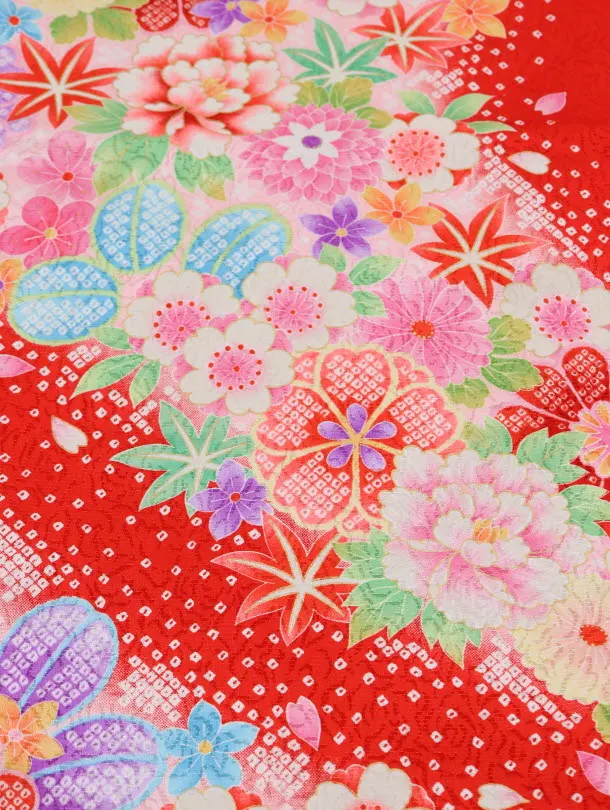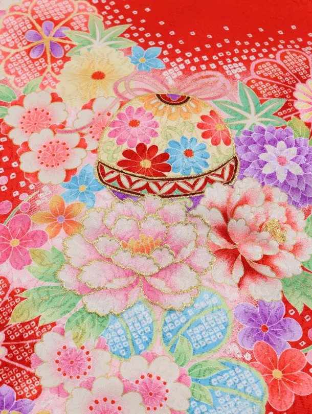 女児産着 お宮参り 1556 単衣 赤地 鈴 花流し