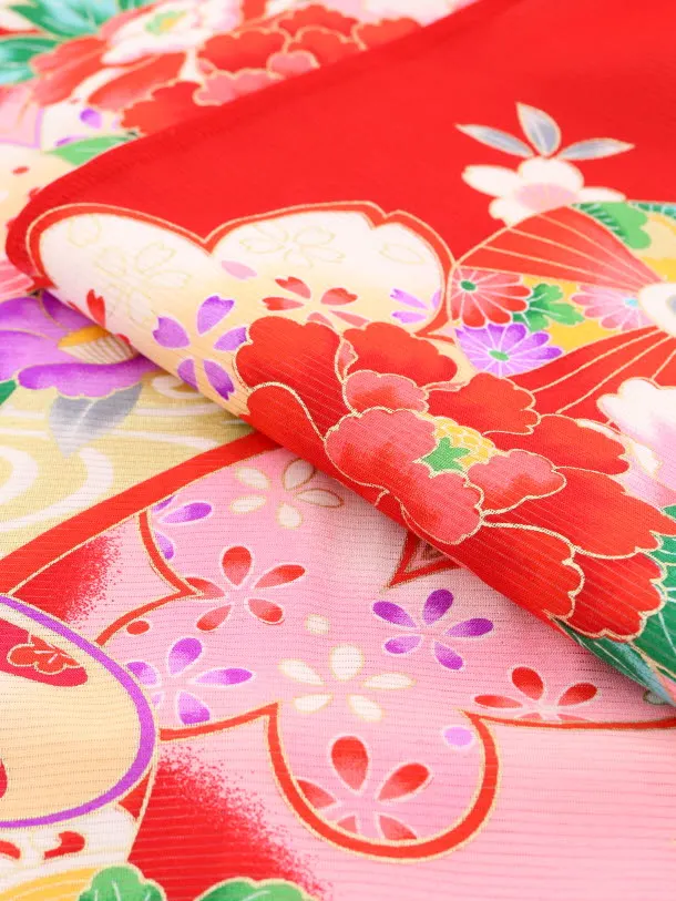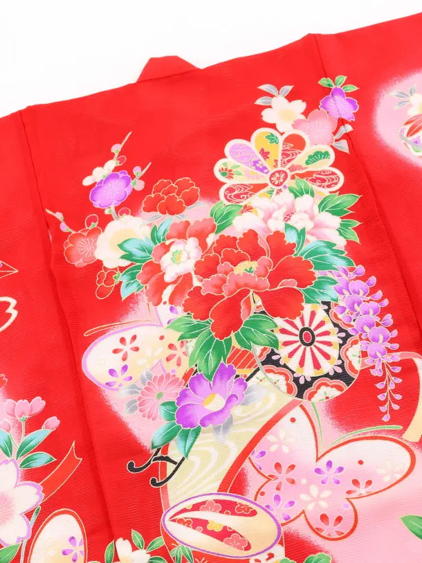 赤地に、牡丹を乗せた花車が描かれたお着物です。花車と、華やかな牡丹に彩られた鈴が女の子らしく可愛らしい雰囲気です。お宮参りや記念撮影におすすめです。
