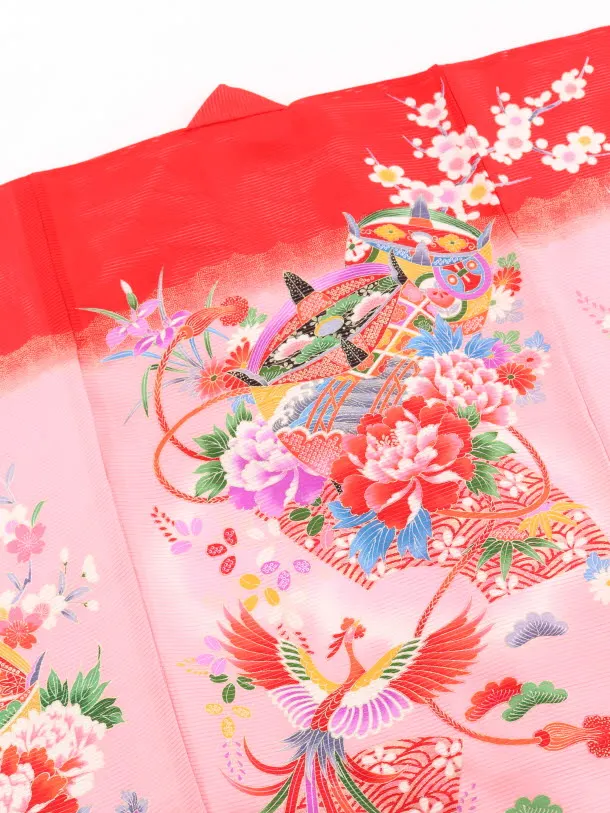赤地に、扇や牡丹などが描かれたお着物です。正統派の古典柄と花柄で華やかな柄になっております。お子様の健やかなる成長を願う日にふさわしい一枚です。