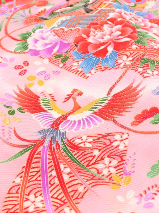 夏用 女児産着 お宮参り 正絹 絽 1579 赤地 ピンクぼかし 扇に牡丹