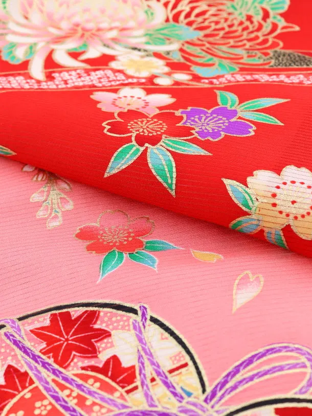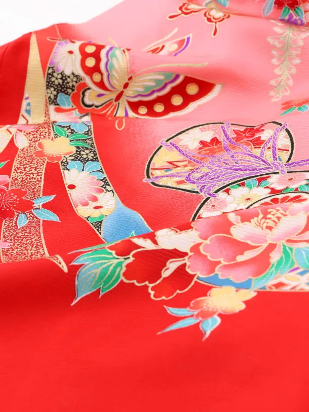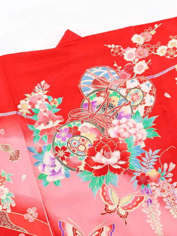 赤地に、鼓(つづみ)、熨斗(のし)、蝶などが描かれたお着物です。赤地にピンクと鮮やかに描かれた古典柄が華やかな雰囲気です。お宮参りや記念撮影におすすめです。