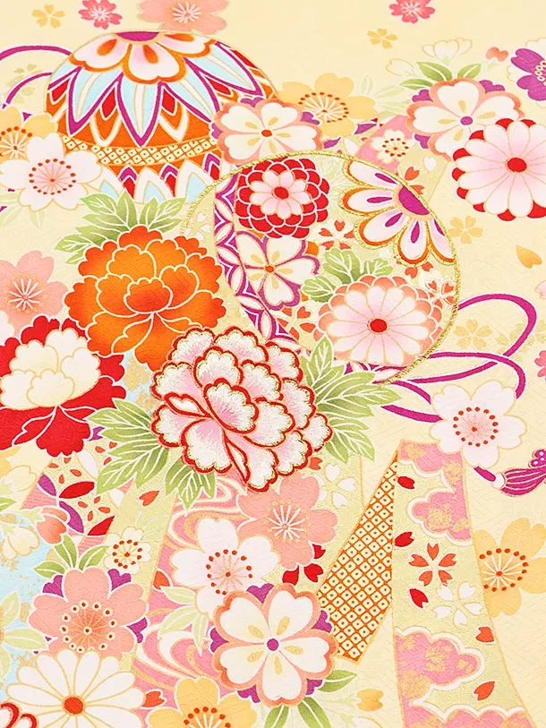 お祝い着をかける時は 絵柄がよく見える様に広げ抱いた子供の体を覆う様に掛け産着の付紐の一方を肩側から他方を脇から通して 抱き手の方の背で蝶結びにします。