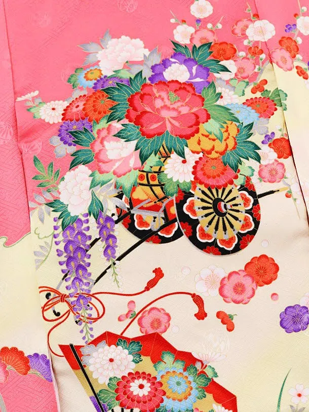 女児産着 お宮参り レンタル 1615 ピンククリーム花車に扇