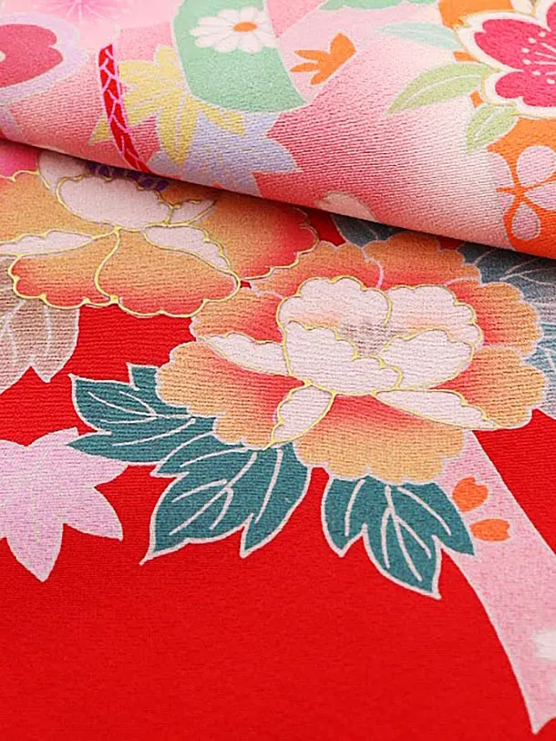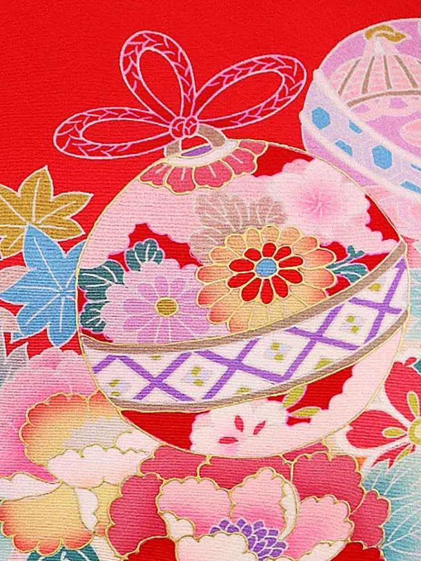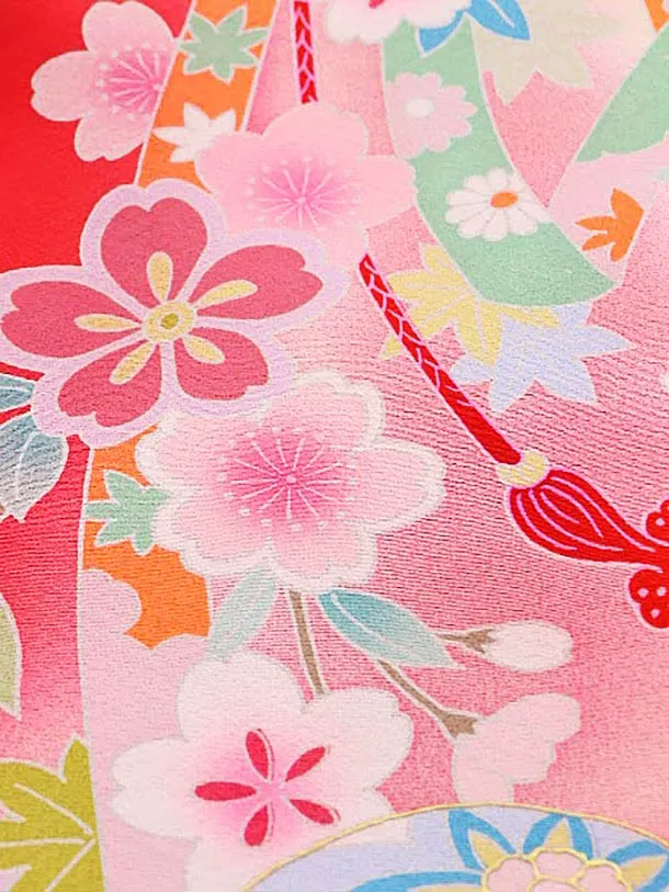 女児産着 お宮参りレンタル1687 正絹 赤地 桜熨斗 鈴 牡丹