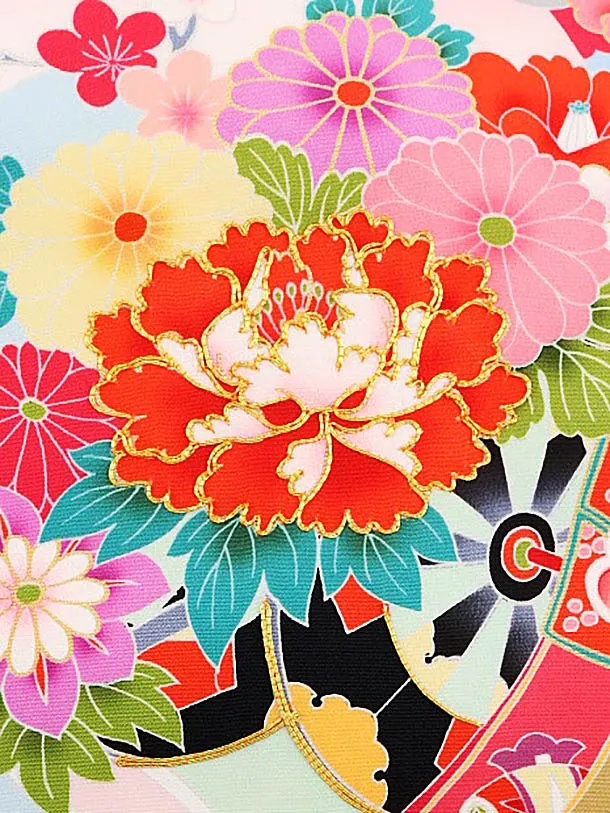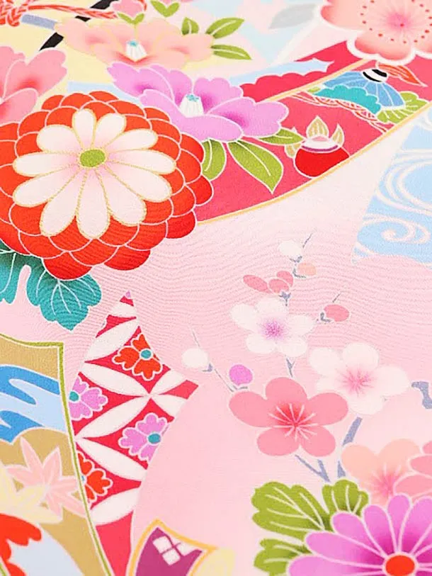 女児産着 お宮参りレンタル1690 正絹 ピンク地 花車に熨斗