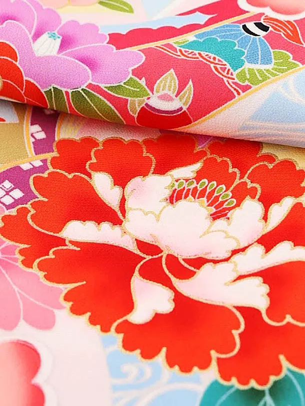 お祝い着をかける時は 絵柄がよく見える様に広げ抱いた子供の体を覆う様に掛け産着の付紐の一方を肩側から他方を脇から通して 抱き手の方の背で蝶結びにします。