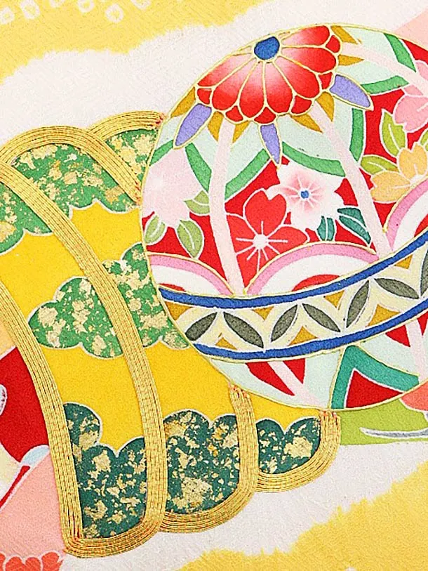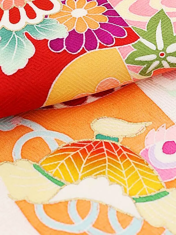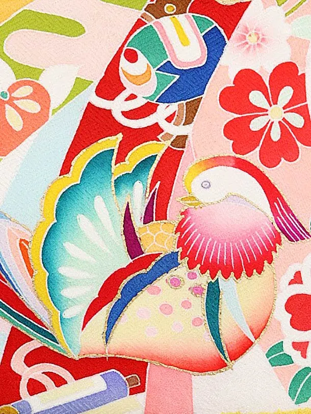 お祝い着をかける時は 絵柄がよく見える様に広げ抱いた子供の体を覆う様に掛け産着の付紐の一方を肩側から他方を脇から通して 抱き手の方の背で蝶結びにします。