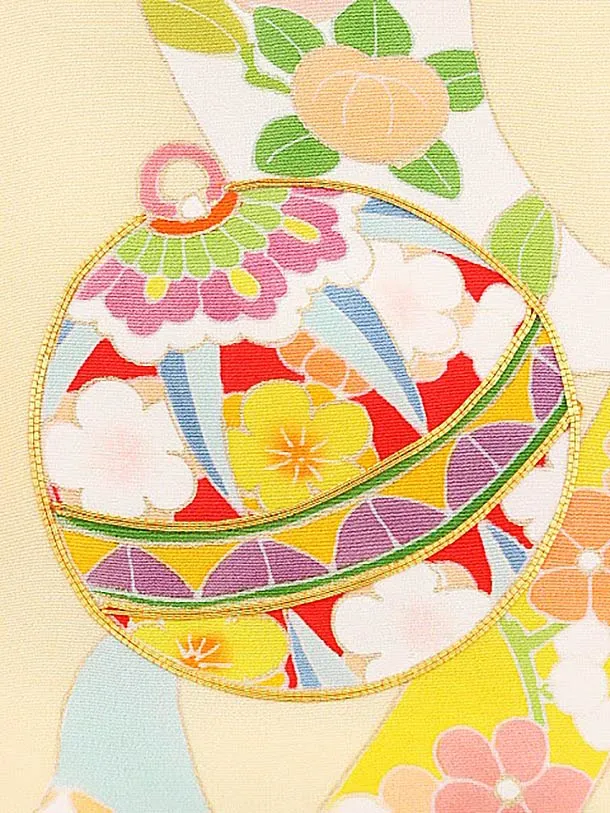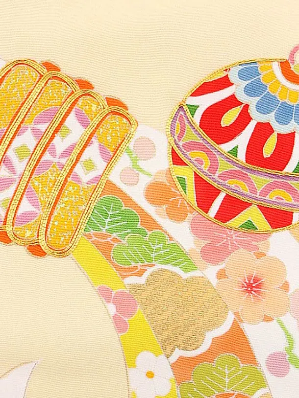 お祝い着をかける時は 絵柄がよく見える様に広げ抱いた子供の体を覆う様に掛け産着の付紐の一方を肩側から他方を脇から通して 抱き手の方の背で蝶結びにします。