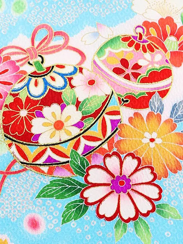お祝い着をかける時は 絵柄がよく見える様に広げ抱いた子供の体を覆う様に掛け産着の付紐の一方を肩側から他方を脇から通して 抱き手の方の背で蝶結びにします。