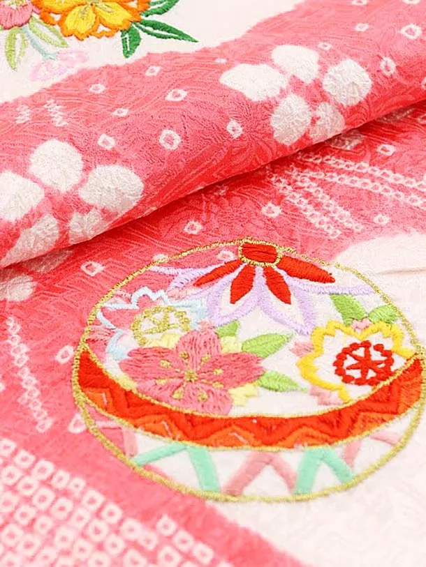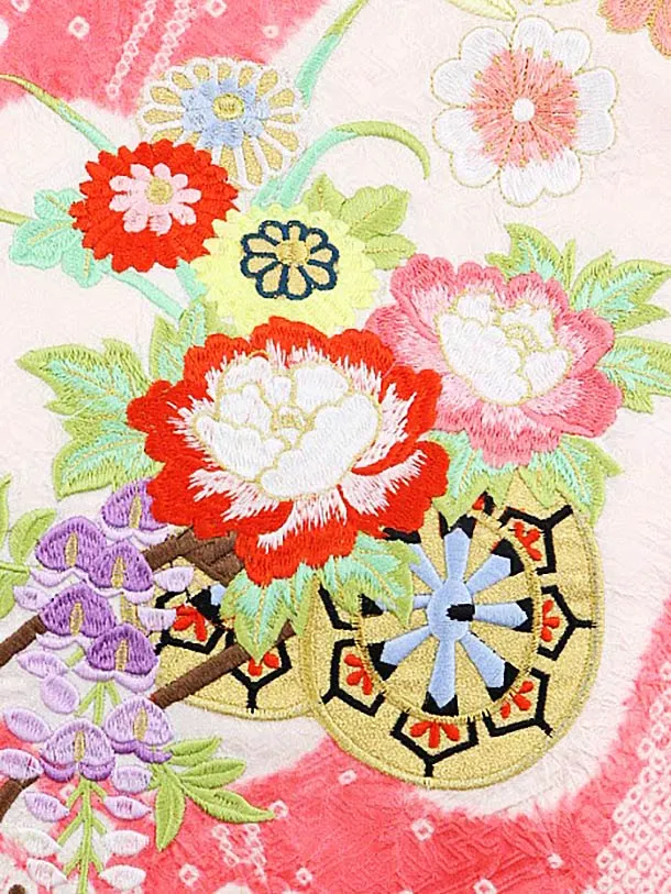 女児産着 お宮参りレンタル1717 正絹 ピンク地 絞り 刺繍 花車