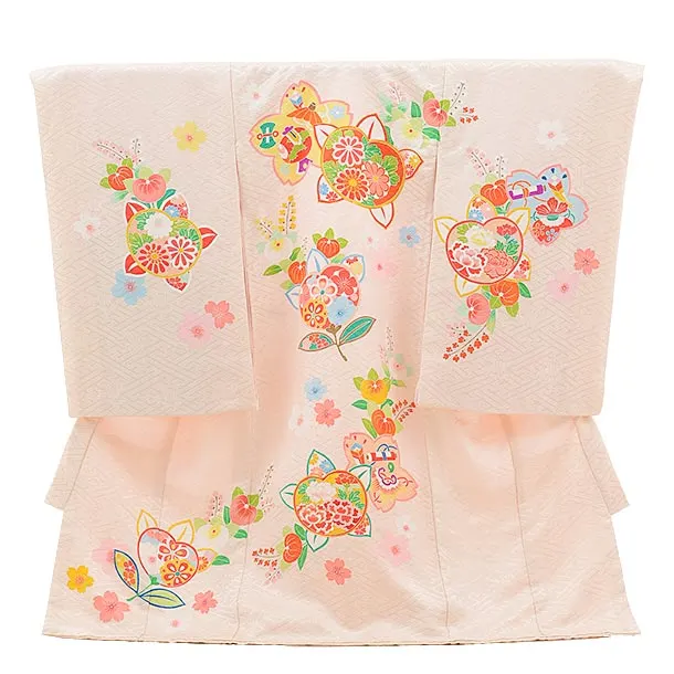 お祝い着をかける時は 絵柄がよく見える様に広げ抱いた子供の体を覆う様に掛け産着の付紐の一方を肩側から他方を脇から通して 抱き手の方の背で蝶結びにします。
