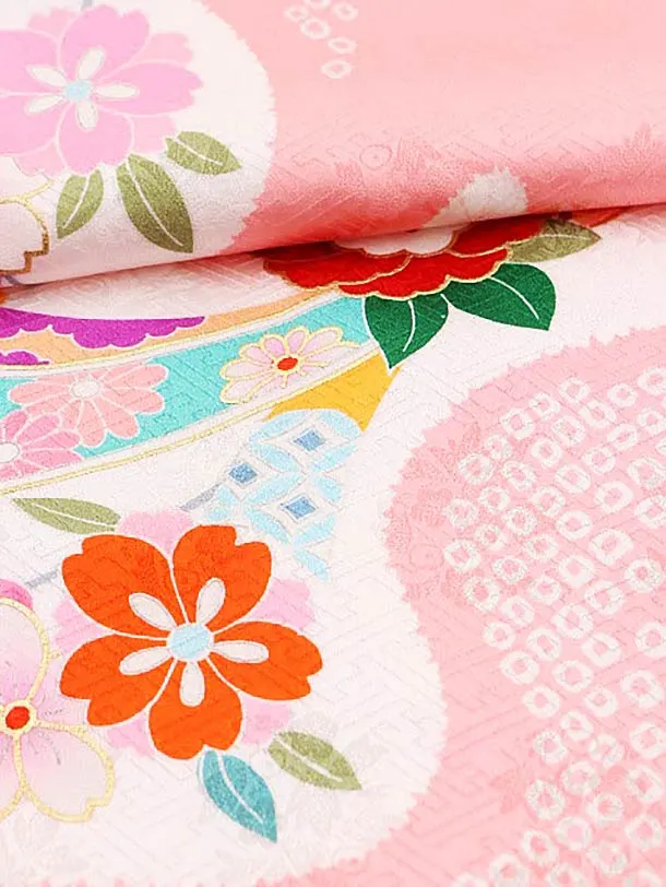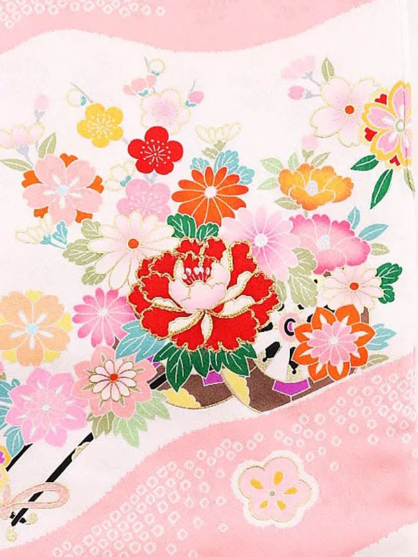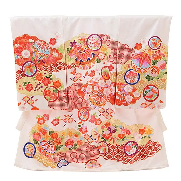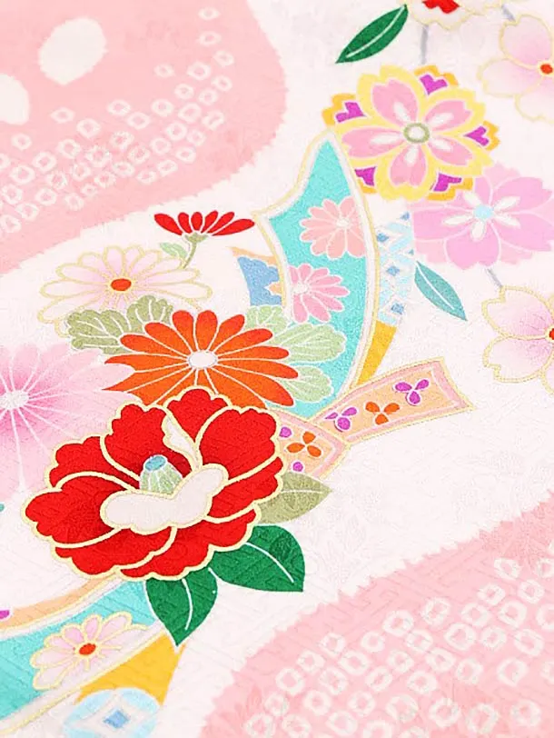 女児産着 お宮参りレンタル1721 正絹 白ピンク地 花車 まり