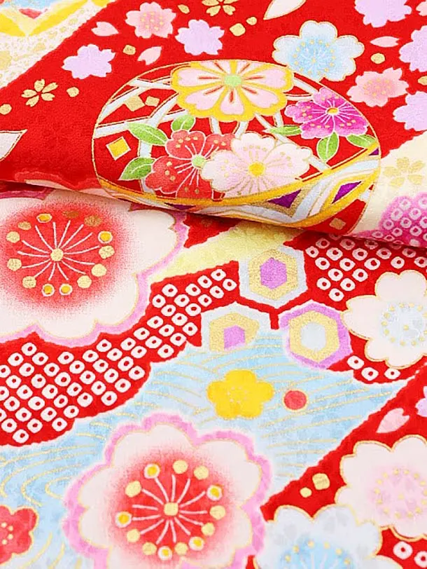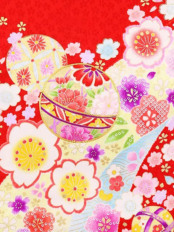 女児産着 お宮参りレンタル1722 正絹 赤地 まり 桜散らし