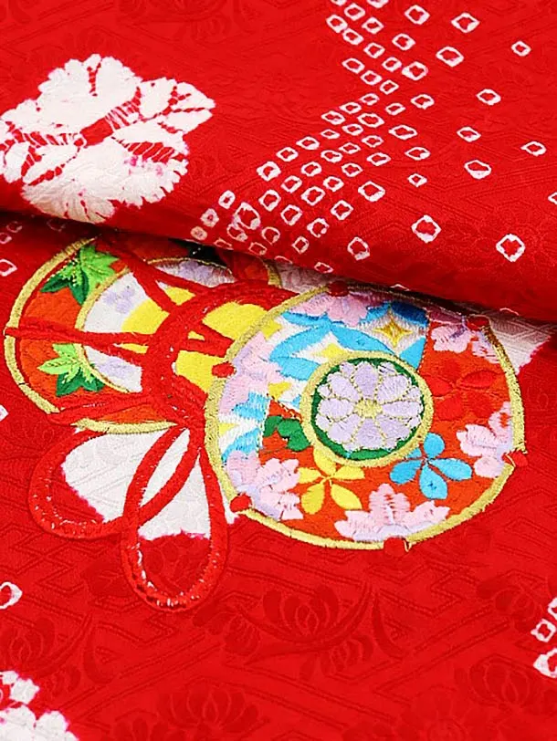 女児産着 お宮参りレンタル1726 正絹 赤地 刺繍 鼓にまり