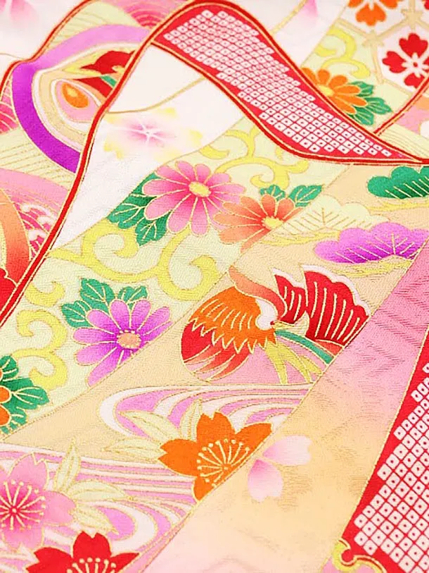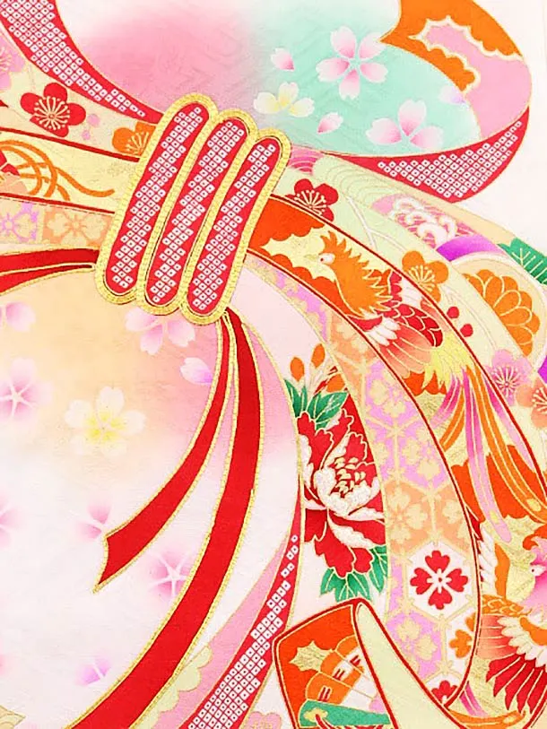 お祝い着をかける時は 絵柄がよく見える様に広げ抱いた子供の体を覆う様に掛け産着の付紐の一方を肩側から他方を脇から通して 抱き手の方の背で蝶結びにします。