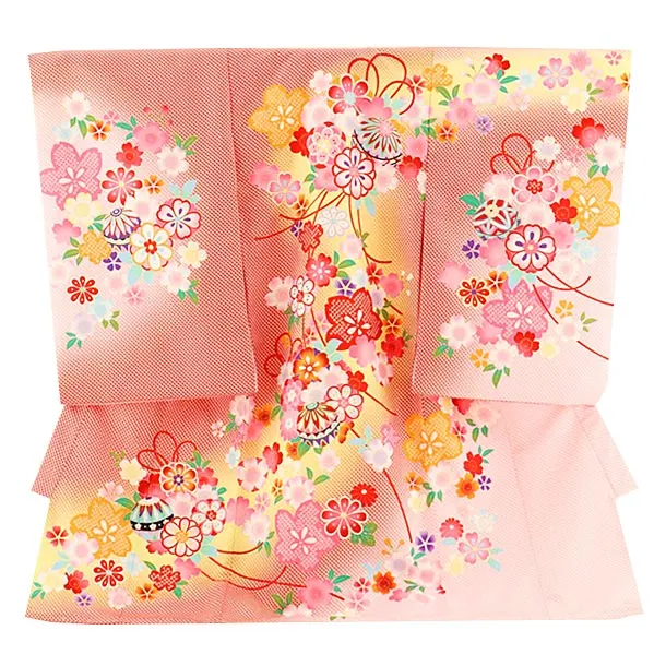 お祝い着をかける時は 絵柄がよく見える様に広げ抱いた子供の体を覆う様に掛け産着の付紐の一方を肩側から他方を脇から通して 抱き手の方の背で蝶結びにします。
