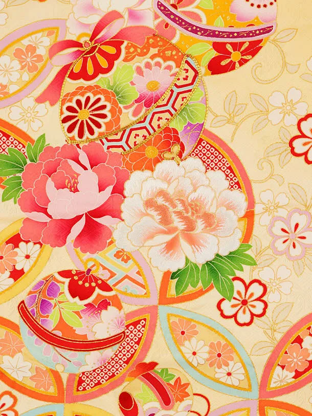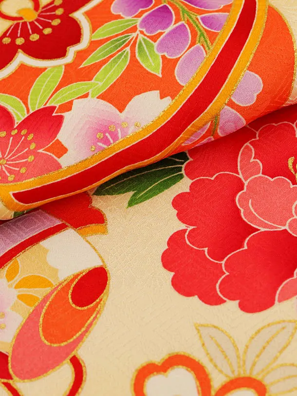 女児産着 お宮参りレンタル1756 【正絹】薄オレンジ裾ピンク 鈴刺繍ぼたん