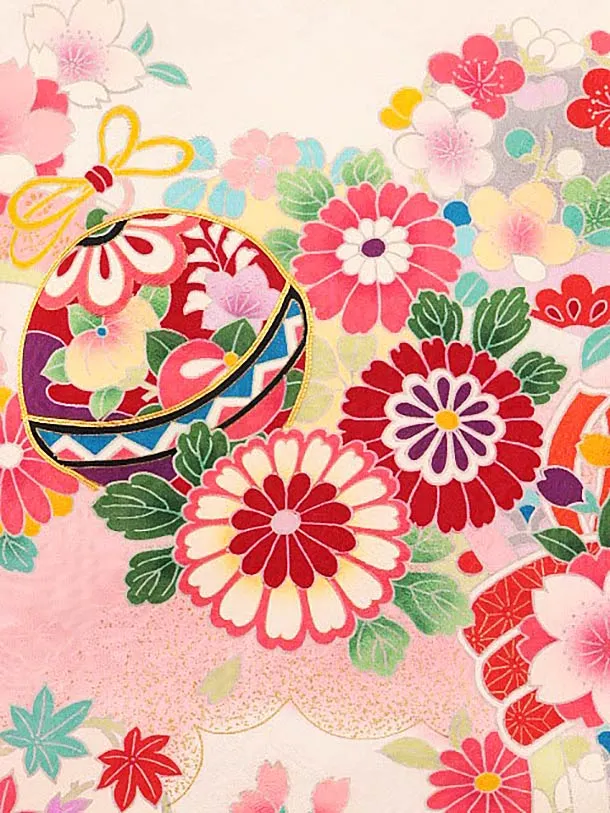 お祝い着をかける時は 絵柄がよく見える様に広げ抱いた子供の体を覆う様に掛け産着の付紐の一方を肩側から他方を脇から通して 抱き手の方の背で蝶結びにします。