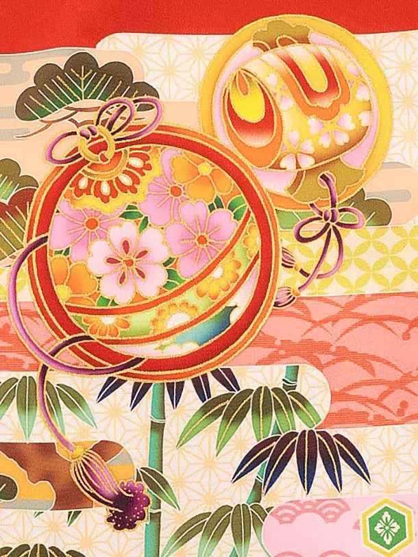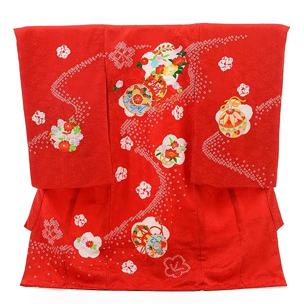 女児産着 お宮参りレンタル1832 赤地 かすみに丸紋 鈴