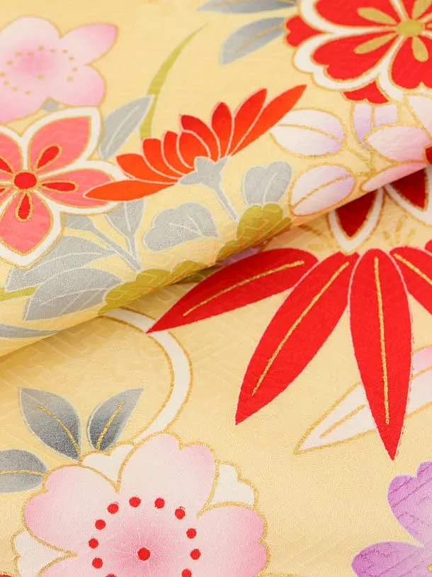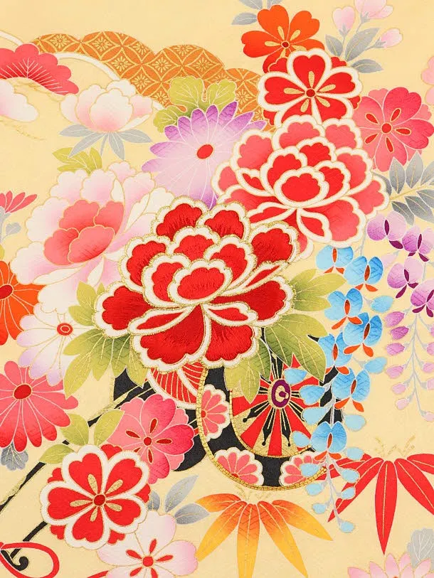 女児産着 お宮参りレンタル1879 正絹 淡黄地 花車に藤