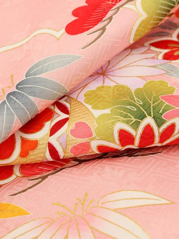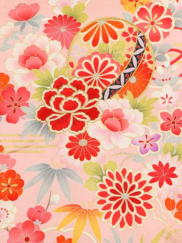 女児産着 お宮参りレンタル1881 正絹 ピンク地 牡丹 まり