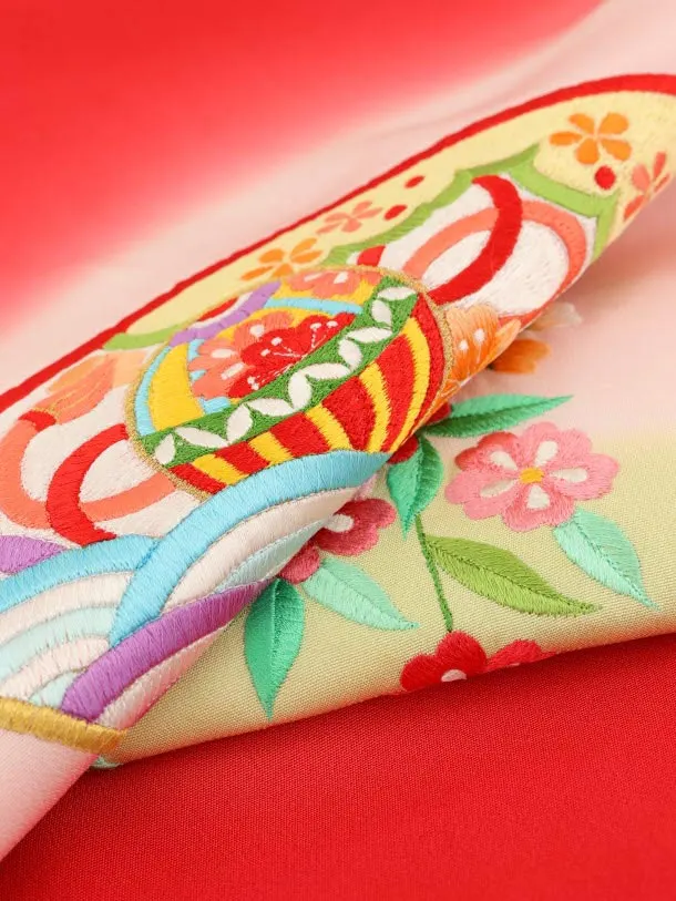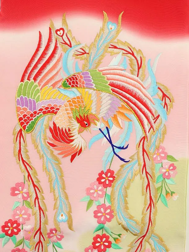 女児産着 お宮参りレンタル1884 【正絹】赤ぼかし 刺繍鳳凰 桜