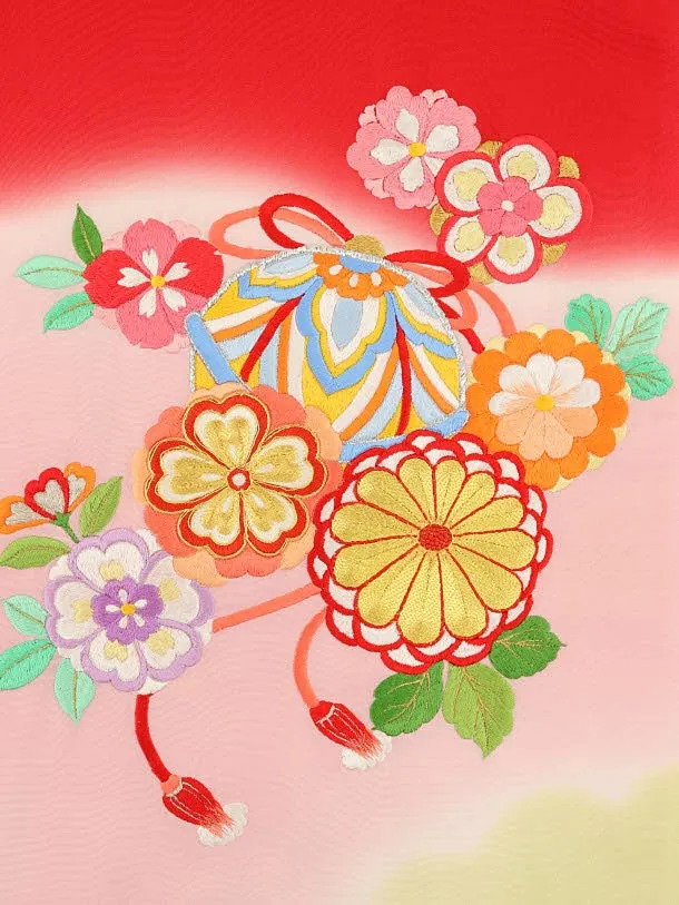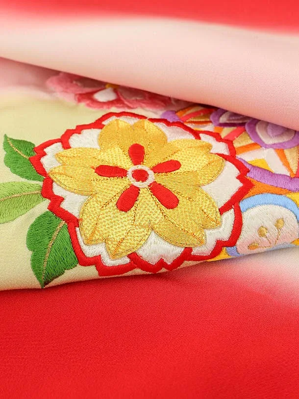 女児産着 お宮参りレンタル1885 【正絹】赤地ぼかし 刺繍菊 鈴