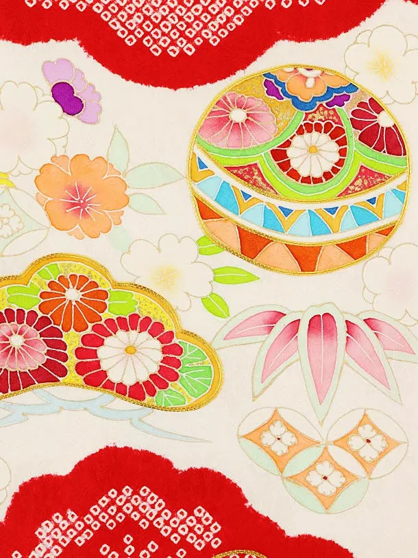 女児産着 お宮参りレンタル1893 【高級正絹】白地雲取り 鞠 松竹梅