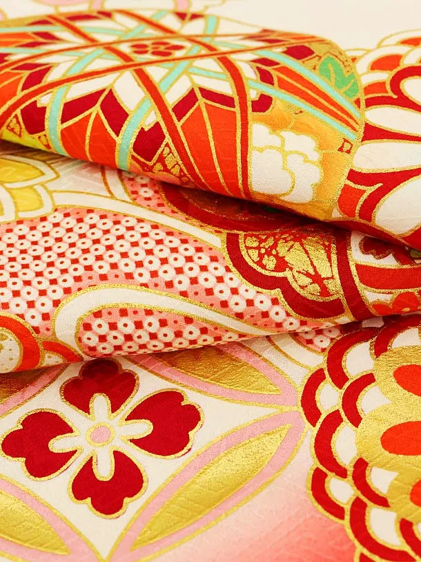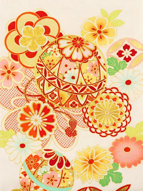 女児産着 お宮参りレンタル1991 正絹 白地裾赤 マリと菊 梅