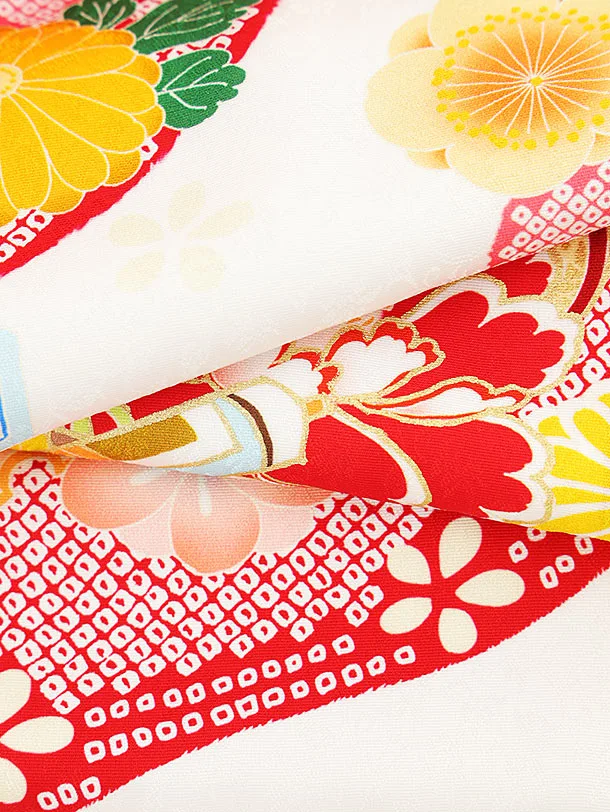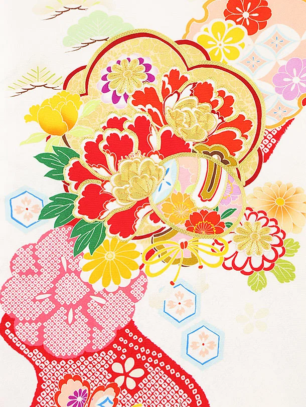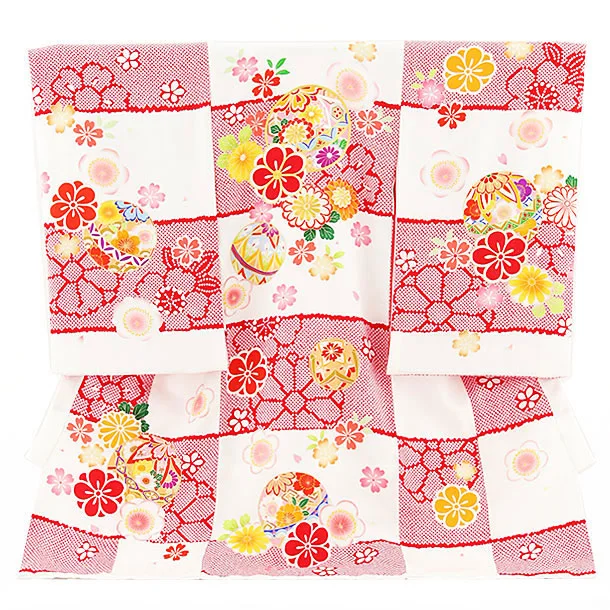 女児産着 お宮参りレンタル2029 正絹 白地 梅に牡丹 小槌