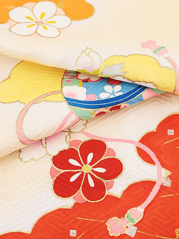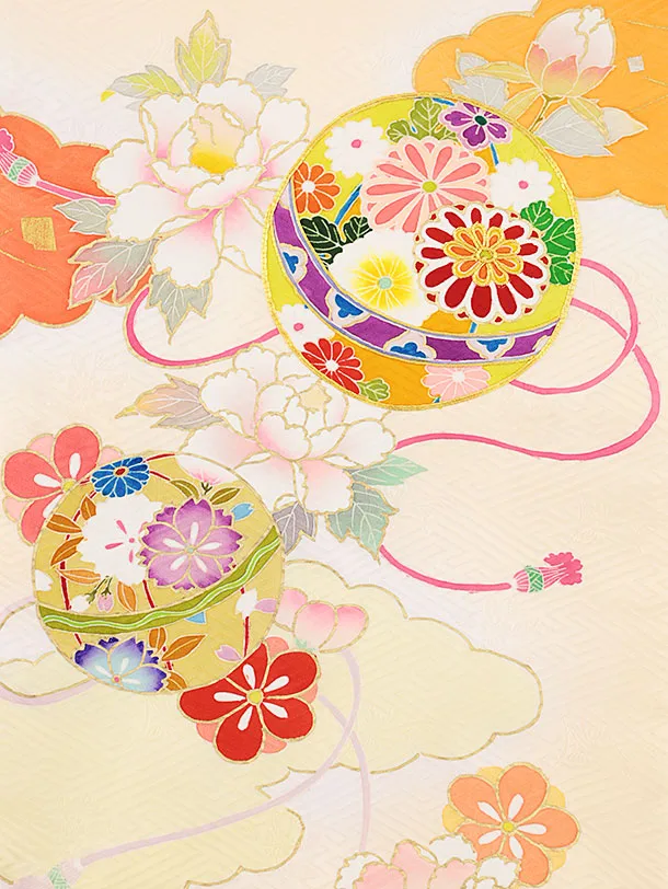 女児産着 お宮参りレンタル2108【高級正絹】鳥の子色 鞠、牡丹