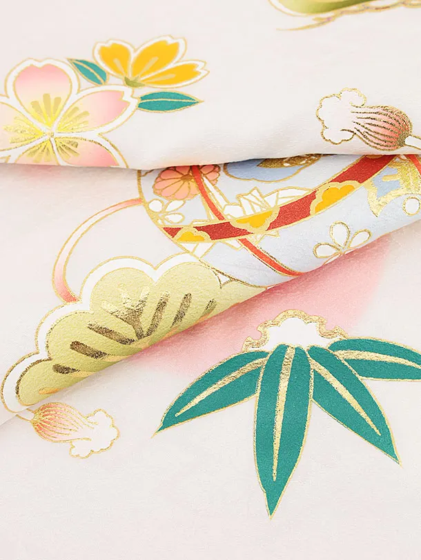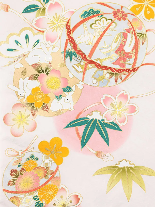 女児産着 お宮参りレンタル2125【正絹】白地 鞠 鈴、うさぎ