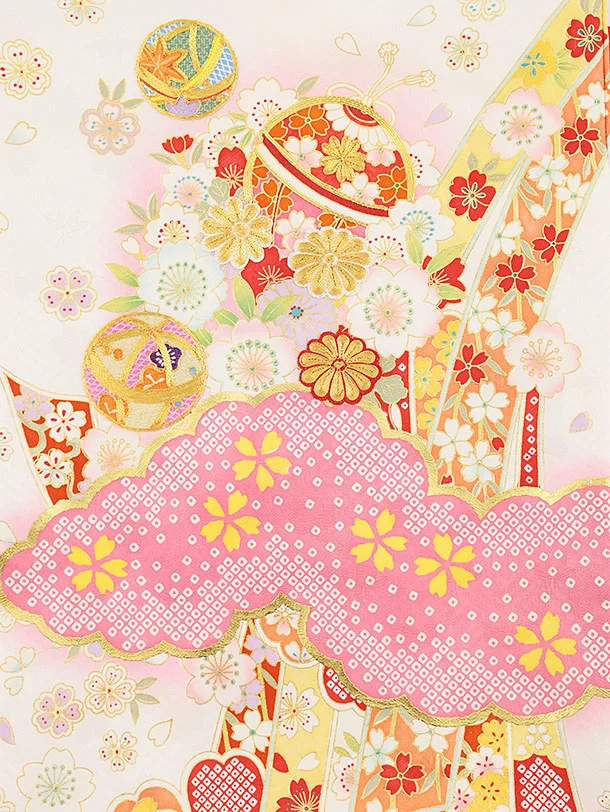 お祝い着をかける時は 絵柄がよく見える様に広げ抱いた子供の体を覆う様に掛け産着の付紐の一方を肩側から他方を脇から通して 抱き手の方の背で蝶結びにします。