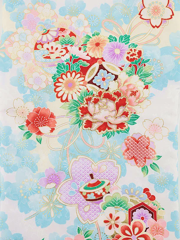 女児産着 お宮参りレンタル2268 白地 鈴に薬玉 水色さくら