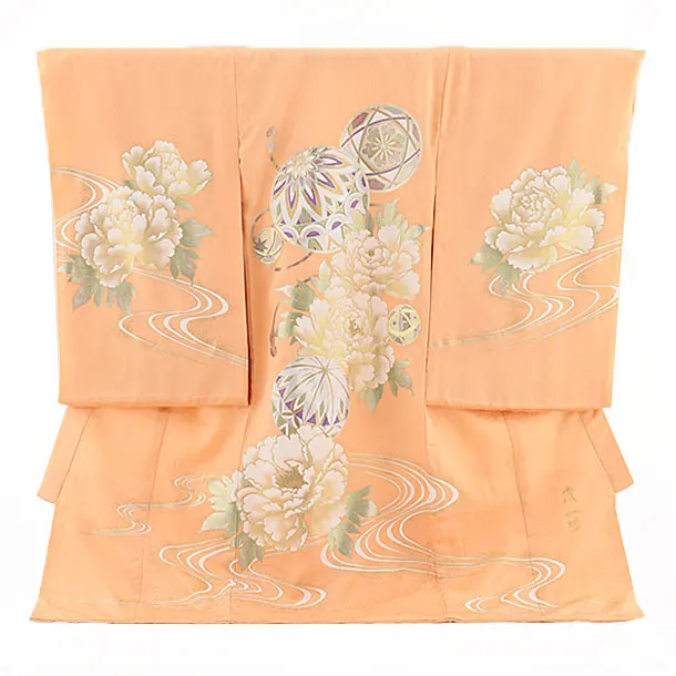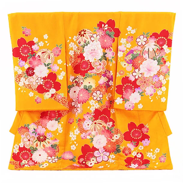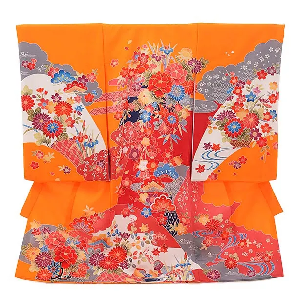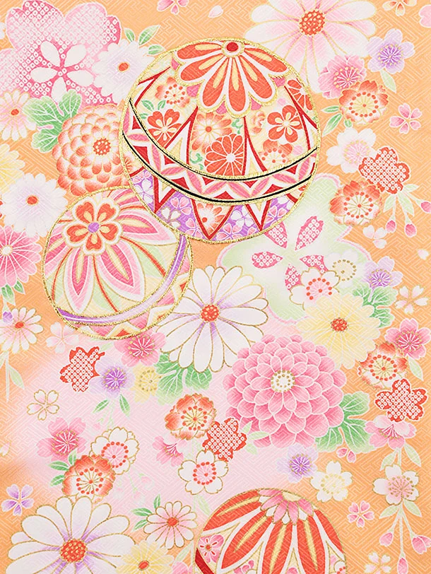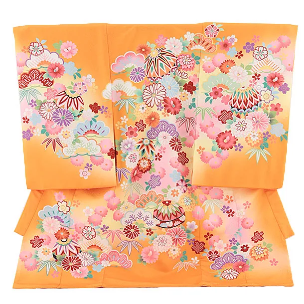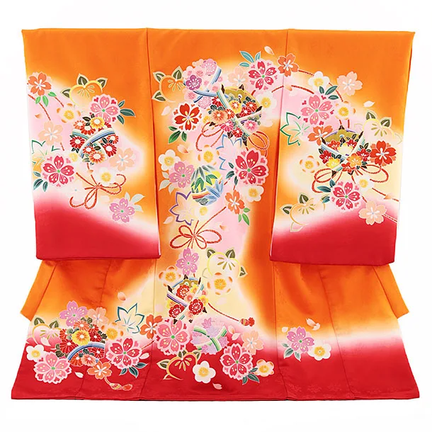 女児産着 お宮参りレンタル2357 オレンジ 鞠に花
