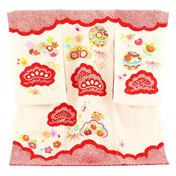 お祝い着をかける時は 絵柄がよく見える様に広げ抱いた子供の体を覆う様に掛け産着の付紐の一方を肩側から他方を脇から通して 抱き手の方の背で蝶結びにします。