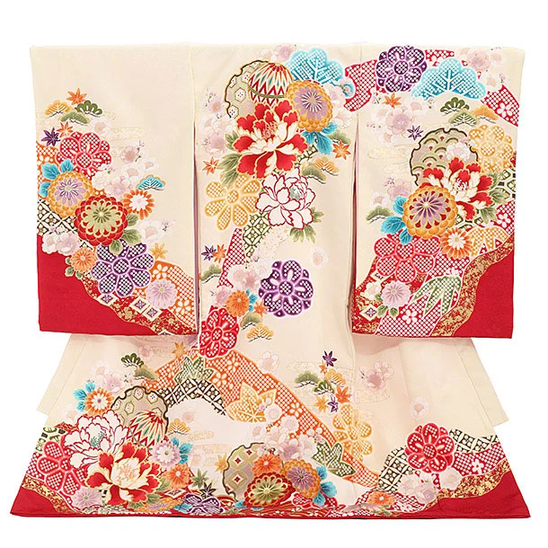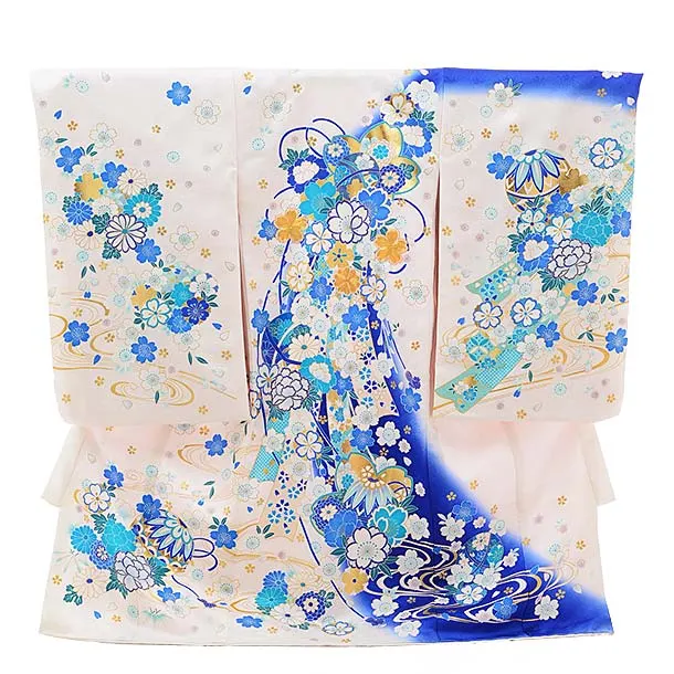 お祝い着をかける時は 絵柄がよく見える様に広げ抱いた子供の体を覆う様に掛け産着の付紐の一方を肩側から他方を脇から通して 抱き手の方の背で蝶結びにします。