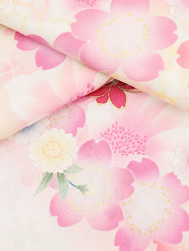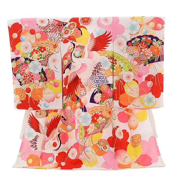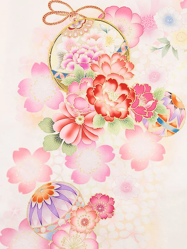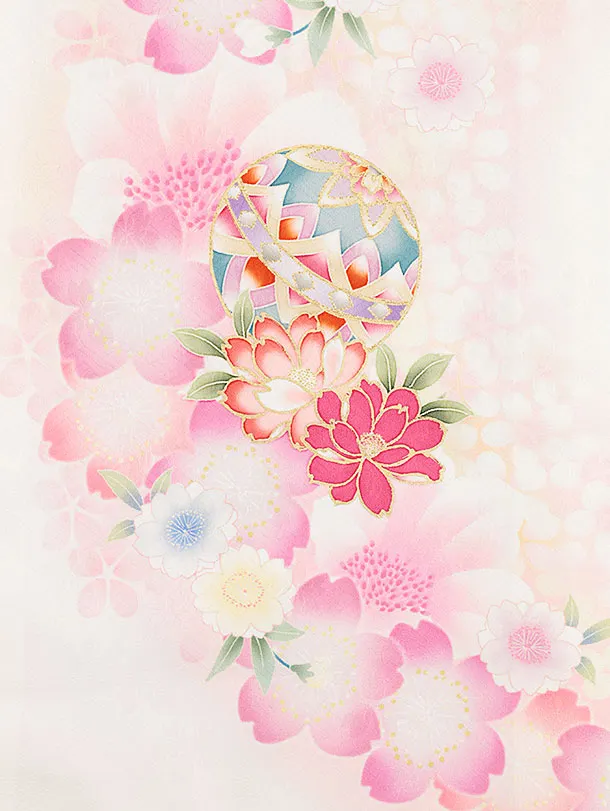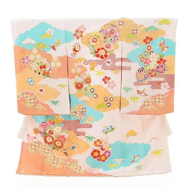女児産着 お宮参りレンタル2532【正絹】白地 鈴とピンク 華づくし
