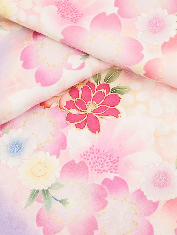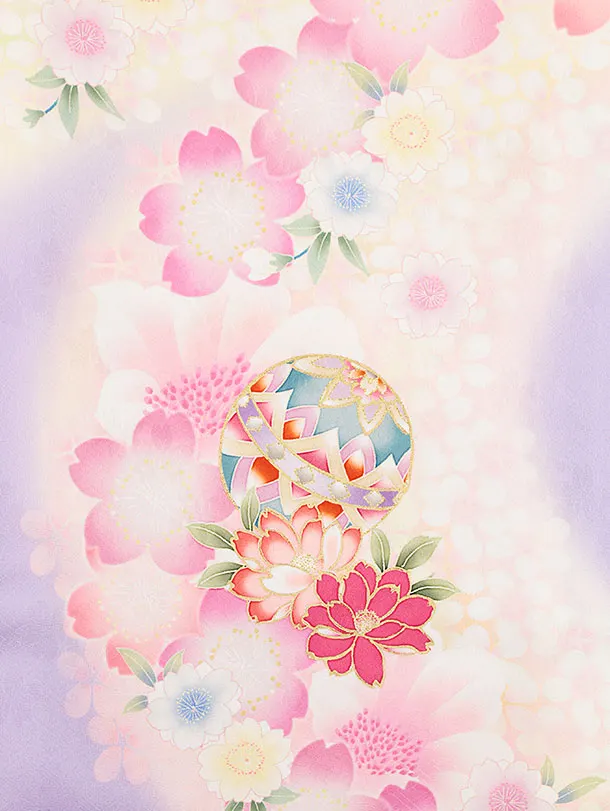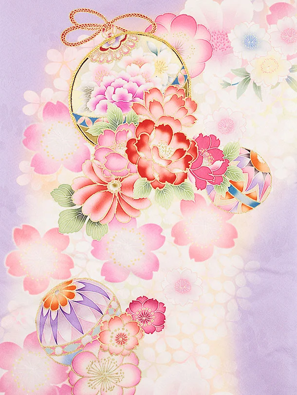 女児産着 お宮参りレンタル2534【正絹】パープル地 鈴とピンク 華づくし