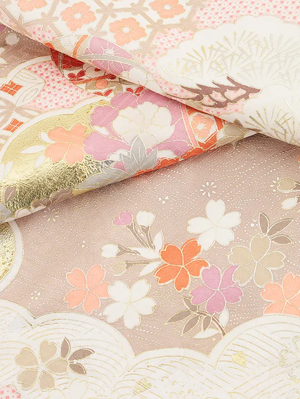 お祝い着をかける時は 絵柄がよく見える様に広げ抱いた子供の体を覆う様に掛け産着の付紐の一方を肩側から他方を脇から通して 抱き手の方の背で蝶結びにします。