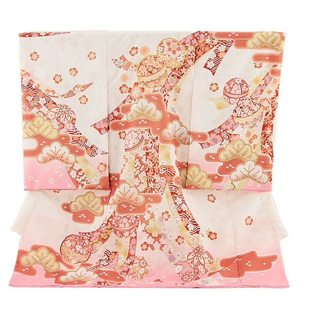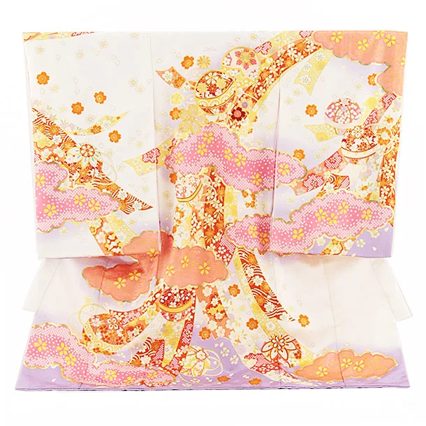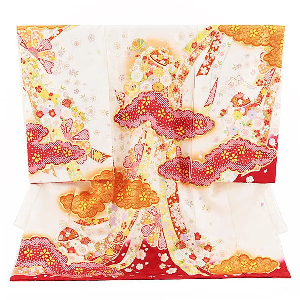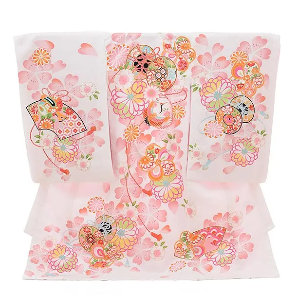女児産着 お宮参りレンタル2714【正絹】白地 鞠と小槌刺繍に桜