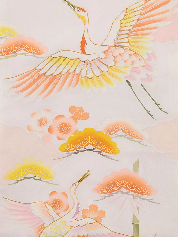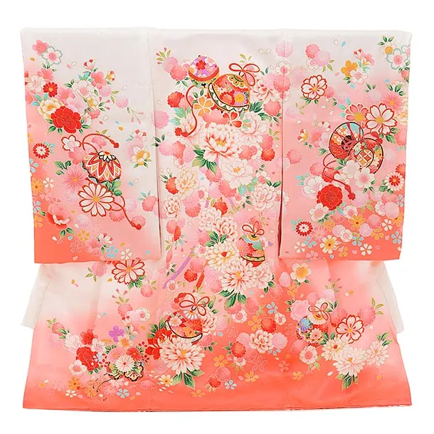 お祝い着をかける時は 絵柄がよく見える様に広げ抱いた子供の体を覆う様に掛け産着の付紐の一方を肩側から他方を脇から通して 抱き手の方の背で蝶結びにします。