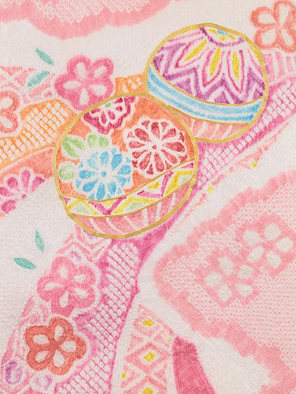 お祝い着をかける時は 絵柄がよく見える様に広げ抱いた子供の体を覆う様に掛け産着の付紐の一方を肩側から他方を脇から通して 抱き手の方の背で蝶結びにします。