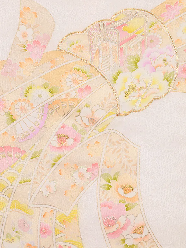 お祝い着をかける時は 絵柄がよく見える様に広げ抱いた子供の体を覆う様に掛け産着の付紐の一方を肩側から他方を脇から通して 抱き手の方の背で蝶結びにします。