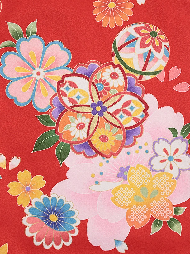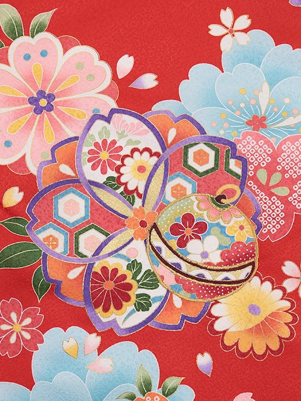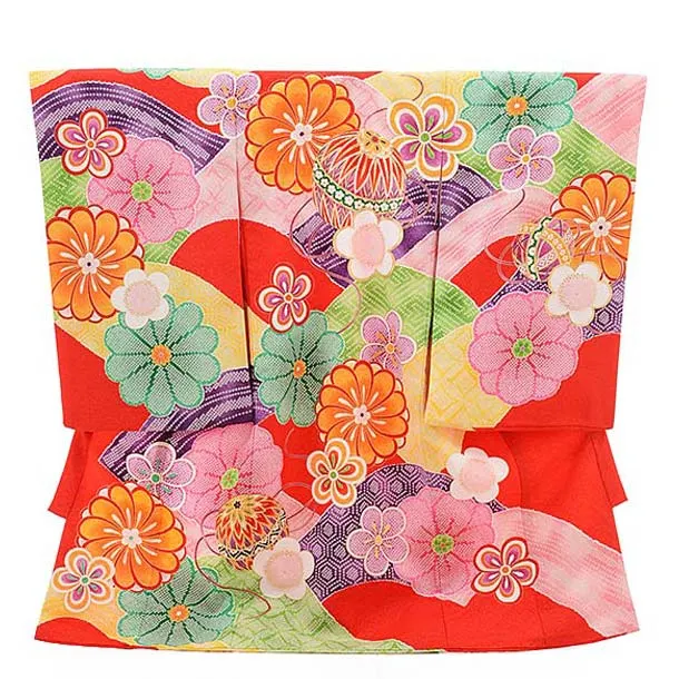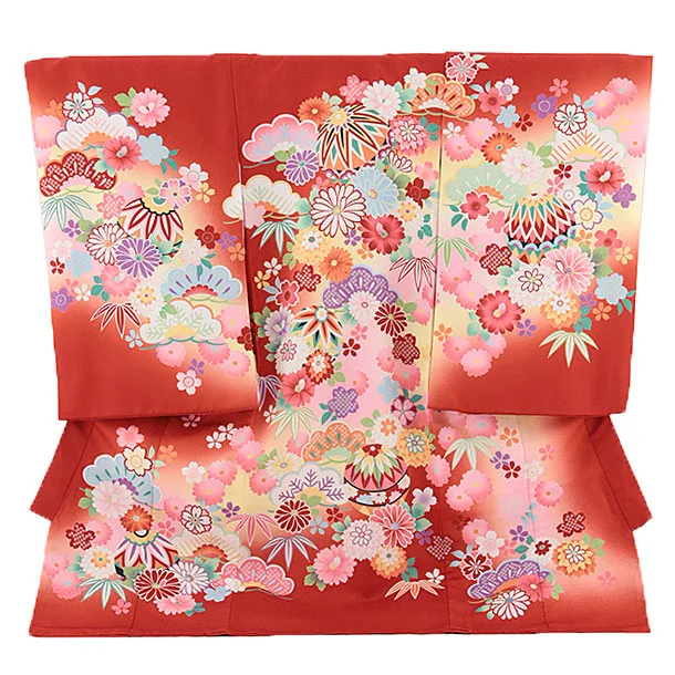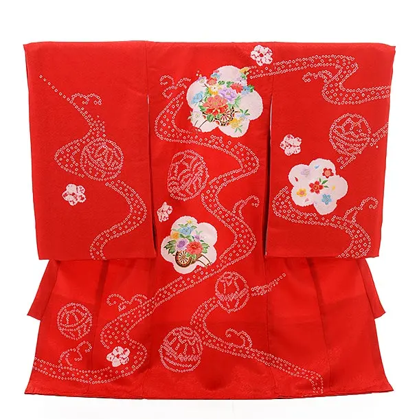 女児産着 お宮参りレンタル2842 赤地 八重桜に鈴