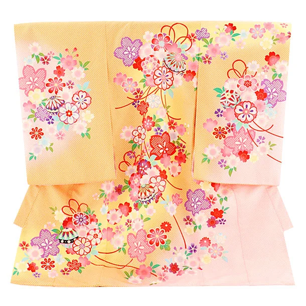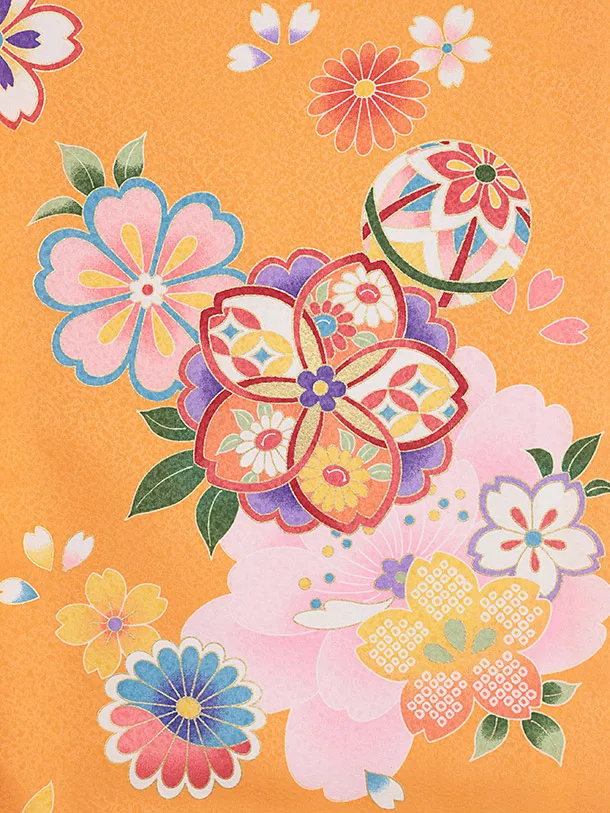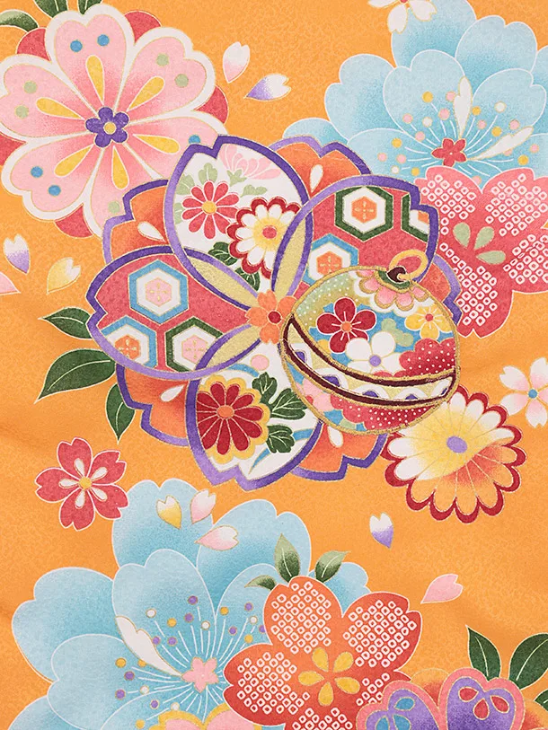 女児産着 お宮参りレンタル2844 オレンジ 八重桜に鈴