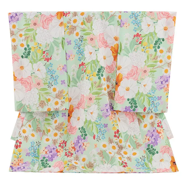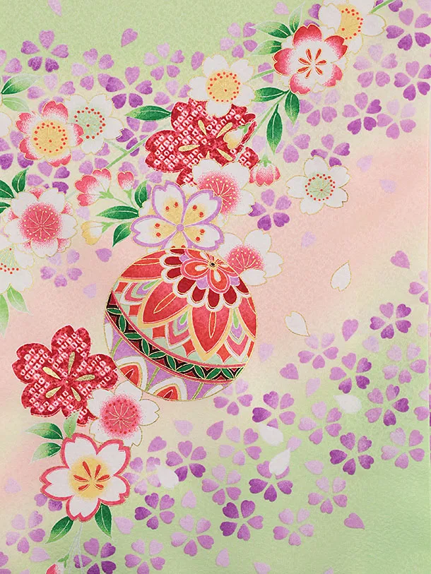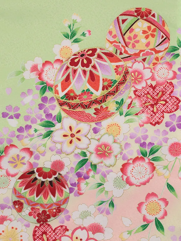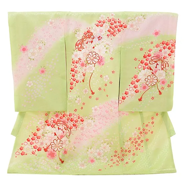 女児産着 お宮参りレンタル2908 黄緑 鞠 桜