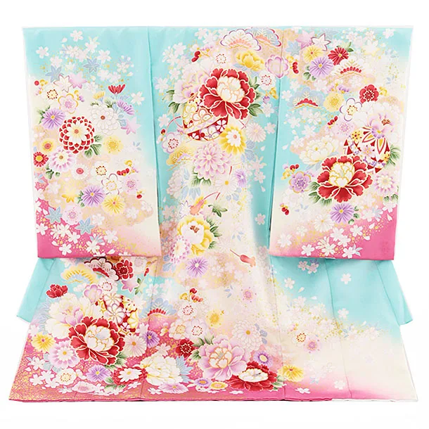 お祝い着をかける時は 絵柄がよく見える様に広げ抱いた子供の体を覆う様に掛け産着の付紐の一方を肩側から他方を脇から通して 抱き手の方の背で蝶結びにします。